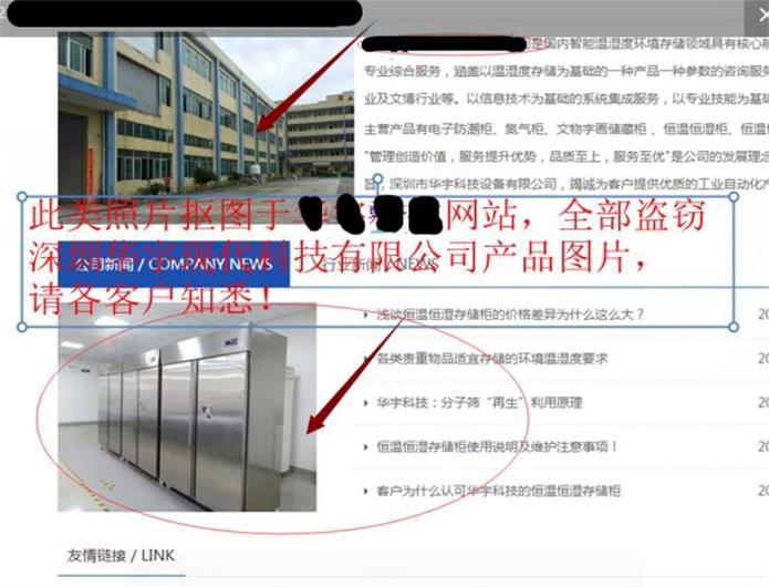 深圳市華宇現(xiàn)代科技有限公司擁有一項(xiàng)恒溫恒濕存儲(chǔ)柜國(guó)家發(fā)明專利,和多項(xiàng)相關(guān)的結(jié)構(gòu)新型及軟著專利。產(chǎn)品廣泛用于外資企業(yè),大企業(yè),企業(yè)集團(tuán),軍工,醫(yī)藥,博物館,檔案館。最近發(fā)現(xiàn)市面有很多貿(mào)易公司或五金生產(chǎn)廠家,在線下或網(wǎng)絡(luò)上盜用我司的產(chǎn)品資料及圖片進(jìn)行不良銷售活動(dòng)。更有甚者以華宇現(xiàn)代的品牌私下接單,但實(shí)際銷售的產(chǎn)品卻是不具備恒溫恒濕功能的非我司產(chǎn)品?。ɡ绾蜕钲谑腥A宇現(xiàn)代科技有限公司相似名稱來(lái)取名以混淆客戶,更有甚者,其網(wǎng)上全部圖片盜用華宇現(xiàn)代產(chǎn)品圖片,以蒙騙客戶(可以進(jìn)入華宇現(xiàn)代官網(wǎng)www.carlover.cn比較即知))